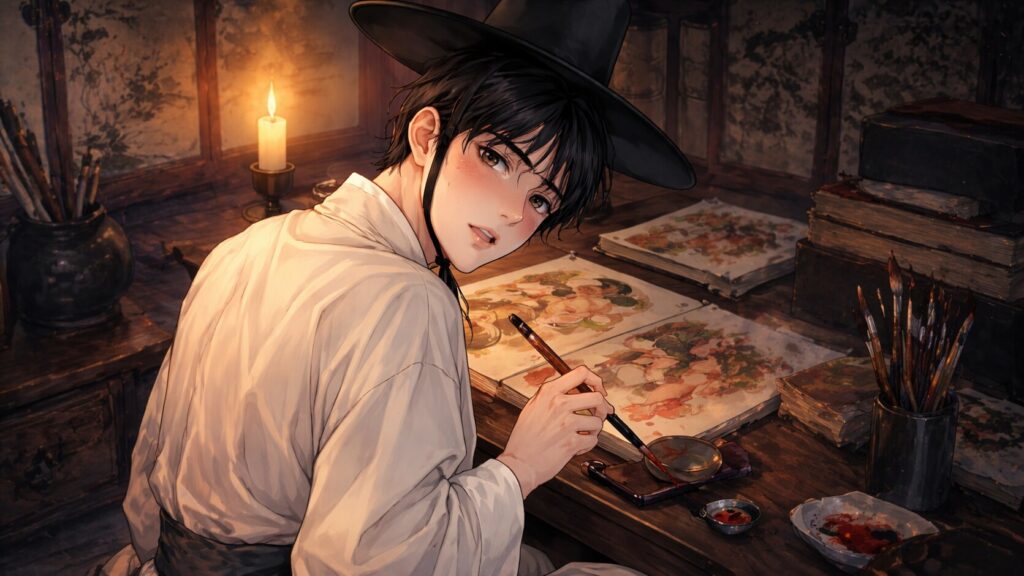 Typically depicted in traditional hanbok with black hair and amber-brown eyes, Na-kyum’s delicate features and modest attire contrast with the sensual intensity of his art. His aesthetic captures both innocence and eroticism—an emblem of the story’s central dualities.